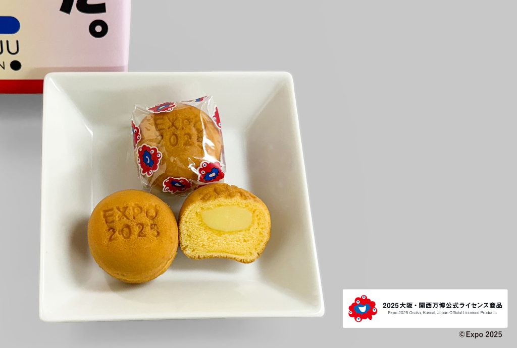 这是一款采用长崎蛋糕(Castella)制成的馒头,表面印有“EXPO2025”字样。内馅是口感柔滑、甜味适中的奶油卡仕达酱。