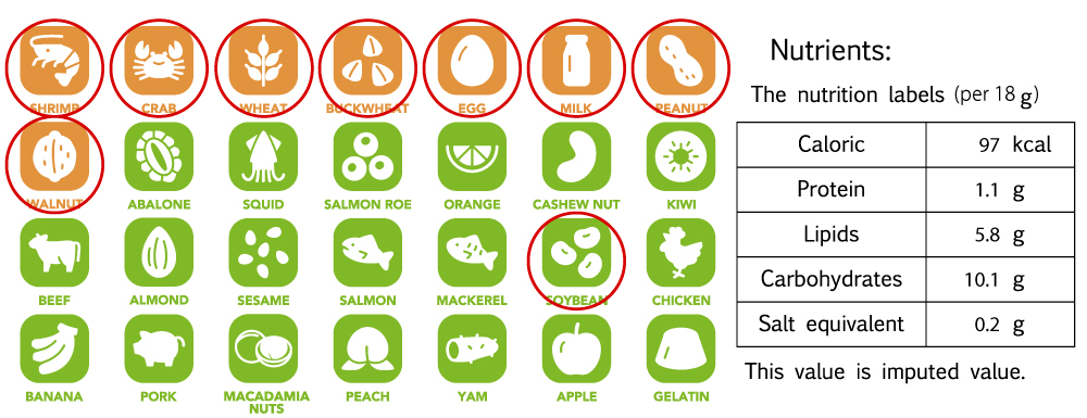 | ■过敏成分 : 本品含有虾、小麦、大豆。 本产品的生产工厂还生产含有鸡蛋、乳制品、 荞麦、花生、蟹、核桃的产品。 本品使用的青海苔采用可能混入 虾蟹的捕捞方式。 |