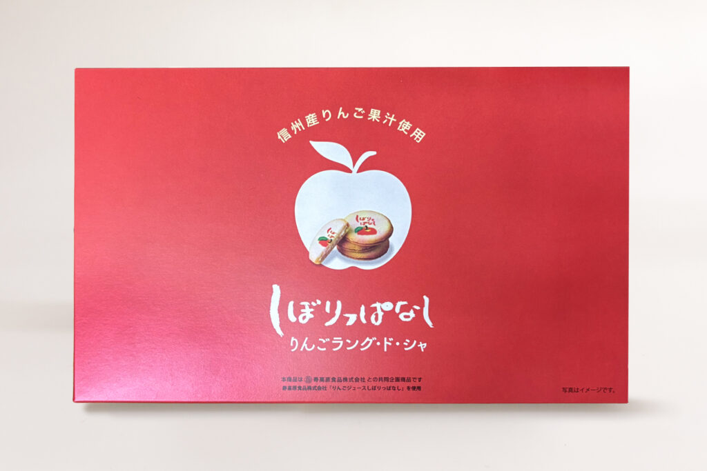Made with “Shiborippanashi Apple Juice” from Kotobuki Kogen Foods Co., Ltd. in Chikuma City, Nagano Prefecture. A crispy round langue de chat cookie made with dough kneaded with apple juice, sandwiching apple cream. A treat packed with the delicious flavor of apples.