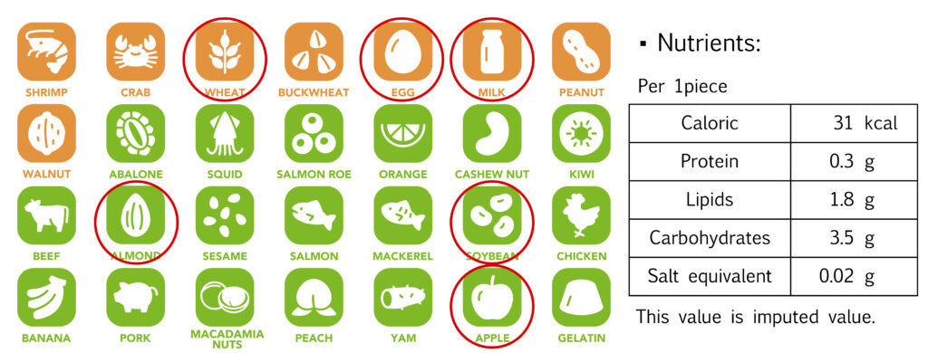 ■Ingredients: Sugar (domestically produced), shortening, wheat flour, liquid egg white, glucose, lactose, almond powder, starch syrup, apple juice (apples from Nagano Prefecture), salt / flavoring, leavening agent, acidulant, emulsifier, coloring (gardenia, safflower yellow), (contains wheat, egg, milk ingredients, almonds, soybeans, apples)