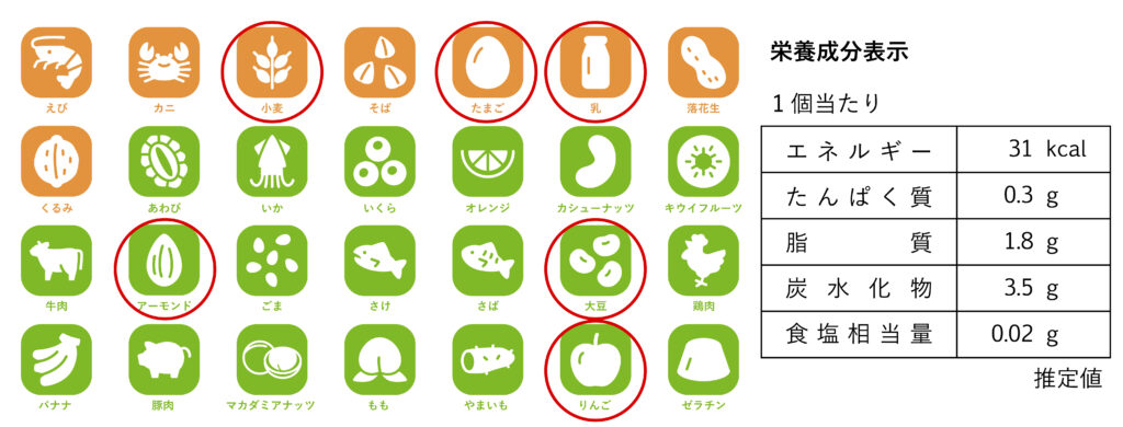 ■原材料名: 砂糖(国内製造)、ショートニング、小麦粉、液卵白、ぶどう糖、乳糖、アーモンドパウダー、水飴、りんご果汁(りんご(長野県産))、食塩/香料、膨張剤、酸味料、乳化剤、着色料(クチナシ、紅花黄)、(一部に小麦・卵・乳成分・アーモンド・大豆・りんごを含む)